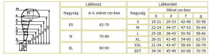 Méretei a combtő (g), comb(f), térd (d) és a boka (b) körmérete alapján (cm):