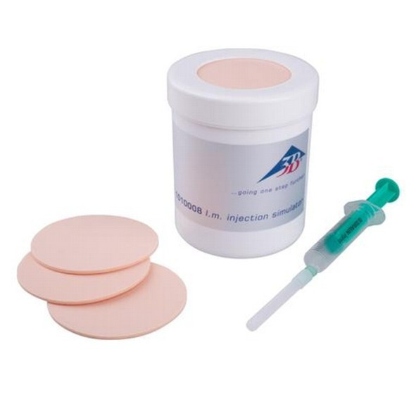 - A 3B Scientific intramuszkuláris injekciós szimulátora három bőrbetéttel együtt kerül szállításra, melyek számos szúrásra alkalmasak